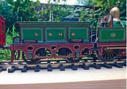 The tender wheels are Slaters, but I’ve used some 10-spoke carriage wheels as they were far closer in profile to the rather delicate wheels of the prototype. Also, the slender outside frames would have made the usual massive 3/16 in axles and horrible inside bearings and frames very obvious, so the wheelsets have proper bearings in the axleboxes, which are arranged to drop out of the frame cut-outs should the need arise. Axles are made up of telescopic sections of K&S tubing and rod. Pick-ups are phosphorbronze strip rubbing on the tops of the tender wheels and power is transferred to the loco by means of the water pipes. These are fixed rigidly to the tender and rub against some sprung wires projecting back from beneath the ash-pan and virtually invisible from any normal viewing angle.
