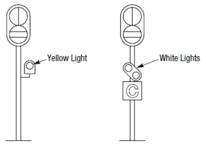 Distant signals have notched ends and are painted yellow with a black horizontal Vee. At night they show a yellow light for caution and a green light for proceed. Figure 4 shows the aspects displayed.