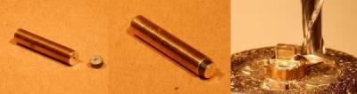Machining an oil pot. The mandrel with a hole and a turned blank with a spigot (left), the blank soldered to the mandrel (centre) and machining the blank (right)