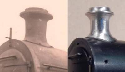 DLOS - The chimney is a rather prominent feature of a steam loco so, as contributes greatly to its ‘character’, I set about modifying the existing chimney. The upper part is a brass turning and is easily removed with a twist and a pull, whereas the lower part (the flared base) is moulded integrally with the smokebox. The several photographs that I had of this LH&JC loco all showed a chimney with a quite different profile (below) but with a secondary flange between the flare and the smokebox.