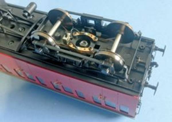 The BR 1 bogies are compensated and the sideframes are screwed to the central frame. Brake shoes and hangers are fitted and are in line with the wheels but no operating linkage is present on the bogies. One bogie has pickups for the interior lighting and there is a miniature slide switch to turn the interior lights off and on. The bogies are mounted to provide a three point suspension, one allows fore and aft rocking and the other side to side, resulting in a very smooth and completely wobble free ride.