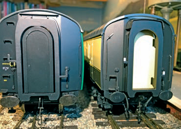 Thirdly, lighting. This is not a feature on Heljan coaches, though you can now buy a £35 Train-Tech battery-operated LED lightbar. Darstaed Mk 1s come with switchable LED lighting plus a taillight on BSKs. Power pick up is via wipers on one bogie. The Lionheart Mk 1s have LEDs with microswitches next to the dynamo, which control the corridors, passenger areas, and guards/luggage area lighting. If you buy the £35 extra DC-fitted chip version, you can convert your rake to an ‘ECS’ working in your platform no-hands! On DCC the LED lighting is bright to modern carriage standards. The Bluebell railway rakes of Mk 1s I guard, do not seem to offer the same ‘easy reading’ light levels. Oddly the BSKs, unlike on the Dapol Collett coaches, do not have a taillight. However the same friction-free split axle pick up via the bogie sides, as on the Colletts and Autocoaches, is offered. As on the Darstaed Mk 1s, interior compartment, guards and luggage area detailing is good; in fact given lighting levels, passengers start to look a necessary accessory!