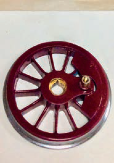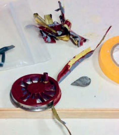 To prevent paint from getting where you don’t need it, I follow Ian Rathbone’s method of using Tamiya tape, stretched onto the perimeter of the wheel tread, with an overlap on the flange. The wheel centre, if you are using Slater’s, also needs masking off. For this, I use a small cone of blu tack, gently pressed into the recess. If like me, you use crankpins from Hobby Holidays, an easy method of protecting these is with a short length of 1.5mm heat shrink tubing. It is a perfect fit, there is no need to heat it.