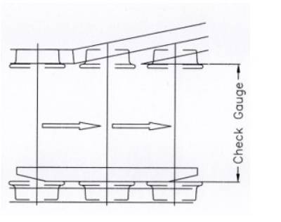 • the check gauge - for the wheels, the distance between the front of one flange and the back of the opposite flange, and for the track, the distance from the guiding face of the check rail to the gauge face of the opposite rail.