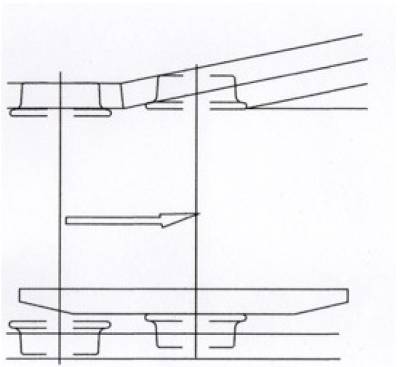 Technically, it does not matter if the check rail is over-gauged, i.e. set too far from the crossing nose, in that the flange on that side will be kept clear of the nose. However, what will happen is that the wheel on the opposite side will strike the flare at the end of the check rail, causing it to be jerked sideways. The ideal situation is where the back of the flange just touches the check rail as it enters the flangeway. For the wheelset, under-gauging is tolerable only up to a point. If the wheels are under-gauge by too much, the distance between the flange backs (the ’back to back’) can be less than the width between the wing and check rail faces. When this occurs, whilst the wheels will still be guided correctly, the flange of the wheel next to the crossing will either become jammed against the wing rail, impeding free running, or in extremis, ride up onto the top of the wing rail, as illustrated in Figure 3 below.