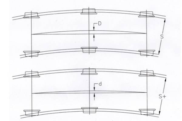 Figure 5 - The effect of gauge widening in easing the passage of multi-axle vehicles through curves. As the track gauge (S) is increased, the extent to which the centre wheelset needs to be displaced (D, d) reduces as a result of the additional sideplay between the wheels and rails.