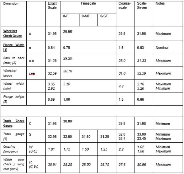 These are applicable to 4ft 8½in prototype gauge models and 7mm = 1ft scale. For other gauges, the principles set out in sections 1.2 and 1.3 above should be applied to generate the standard dimensions for that combination of gauge and wheelset dimensions.