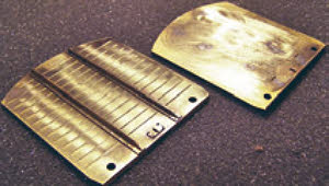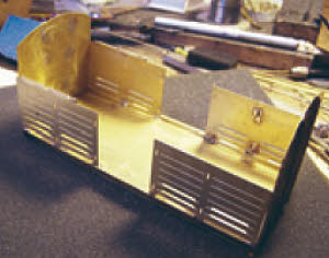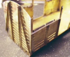 The quality of the parts is very good. The brass used is quite hard and produces crisp folds, certainly much better than the softer material used by some manufacturers. The etches are cleanly done and the lost wax castings are neat and once off the sprue require little in the way of cleaning up. The rivet marks are very fine and difficult to see. I got round this by rubbing the side of the point of a soft pencil over the surface which reveals the rivet marks; an alternative is to place the work to be riveted on the rivet punch next to a strong light which will also show them up. Studying photos shows that the eaves on the roof projected out level with the side stanchions. I found the roof in the kit to be too narrow once rolled and so I added a couple of strips of scrap etch from the kit, one either side to get the correct width.
