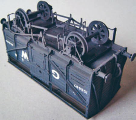 There is full under floor detail. The brakes can be made up to show the prototypical gap between the pull rods but again for the sake of strength I soldered the parts up more solidly. The safety loops fold up from brass etch and although they look flimsy, and so they should, they are really quite strong. The vacuum cylinder is made up from etched brass with top and bottom etched discs. I decided to replace this with a cast GWR wagon vacuum cylinder from ABS. The one I used was in one of their wagon kits for a GWR open that could be built fitted or unfitted and as I had chosen the latter option the vacuum cylinder had gone into the useful bits box.