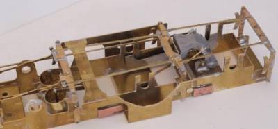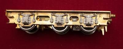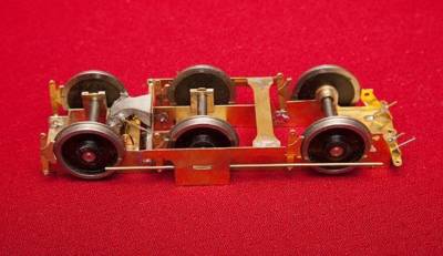 The problem was that the bushes supplied had flanges which were way over thickness; the width over there outsides was about 31.5 mm. Stupidly, I didn't check before soldering them in place (very remiss of me, as it's happened to me before!) so I had to spend 20-30 minutes filing them down. I left them with virtually zero play. I put two of the supplied etched washers on each side of the rear axle (also almost no play) and none on the middle one, which seems to leave adequate side play to pass through a Peco point without problems. I was uncertain how to position the brake shoes, as the wheels had a fair amount of free vertical movement (apart from the front ones) but as their contact, or lack of it, with the wheels is not visible once the frames are in place I erred on the side of caution. I think it might be tricky to replace and remove the wheels once all the parts are fitted.
