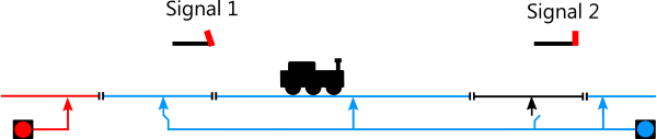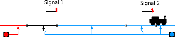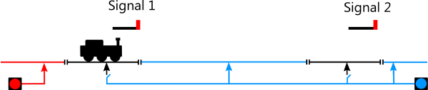 Here we assume each signal controls the isolation its own short section but the power to that section and the subsequent one is fed from the controller in advance. (Though not prototypical, it is convenient if the operator of the blue controller has control of Signal 1. That way they have complete control of the power to the sections of track that they can run over. However, this is not essential.)