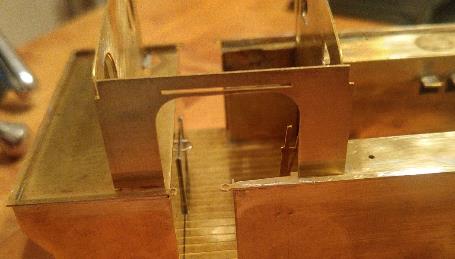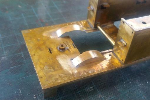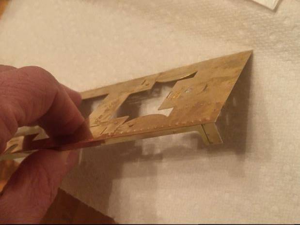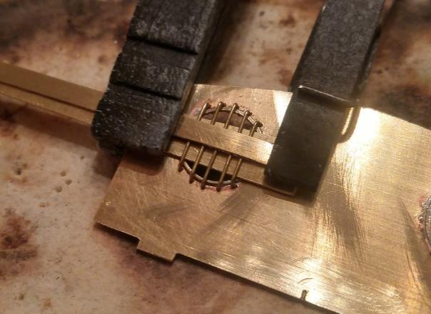 After cleaning the tarnish off the etches, I started from “step 1”, attaching the valences to the footplate. Here's the first piece soldered in place…