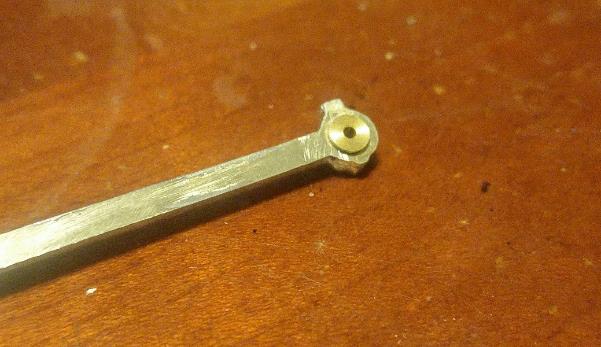 Due to consideration #3, I had to solder together the rear pull rod from 4 etches. The rod is two 1/2 etches (so they're full thickness), and the part which represents the crank is 4 etches thick. (and yes, I realize I didn't solder in the representation of the pin…)