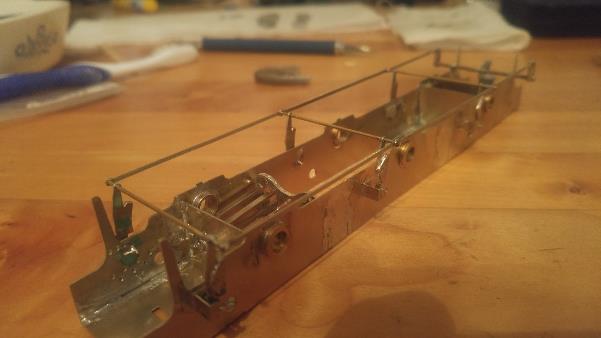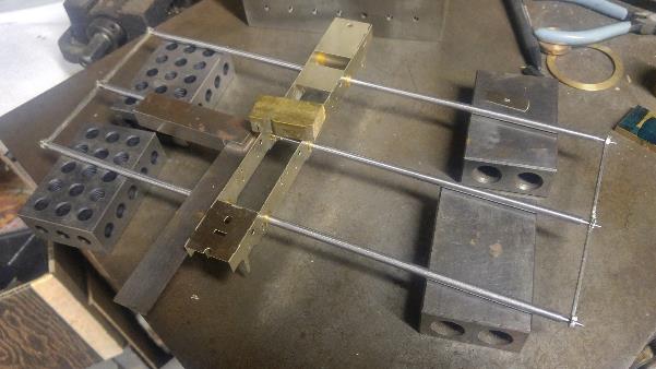 So, in order to keep moving, I soldered the 3 hangers in position on one side, with the pull rods just holding the relative position of the 3 hangers. Hopefully tonight I'll have time to do the other side.