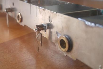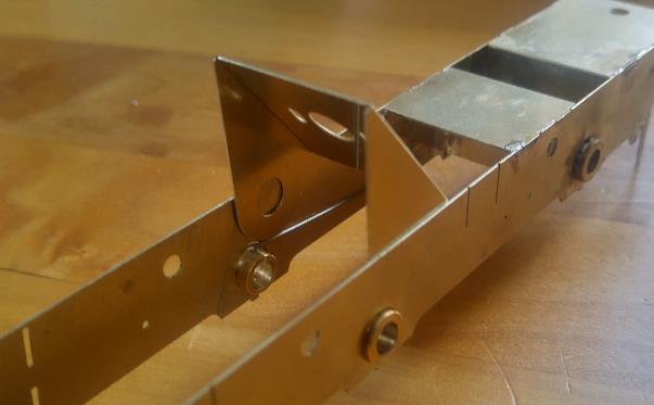 If you do not want the top brake support crossing the chassis you can do them seperately. Cut a 15 mm length of wire, bend 5 mm through 90 degrees. Fit through the frame, short length inside. Turn the chassis on its side so the wire hangs down. Solder inside. If the chassis is supported level the wire should hang square to the chassis side.