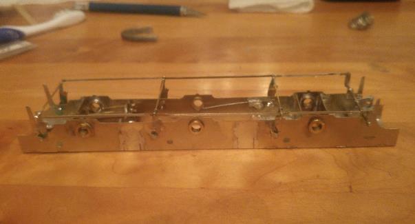 I still need to attach the sand spout to the rear sandbox, but as that'll be a bit prone to breakage, I'll solder that in place once I'm done with the gearbox/pickup wiring. The only other parts left to be attached to the chassis are the 6 cast springs and then the pipes from the sandboxes to either side of the center axle (more parts prone to breakage, might hold off on those as well). Back to trying to get the gearbox running smoothly…