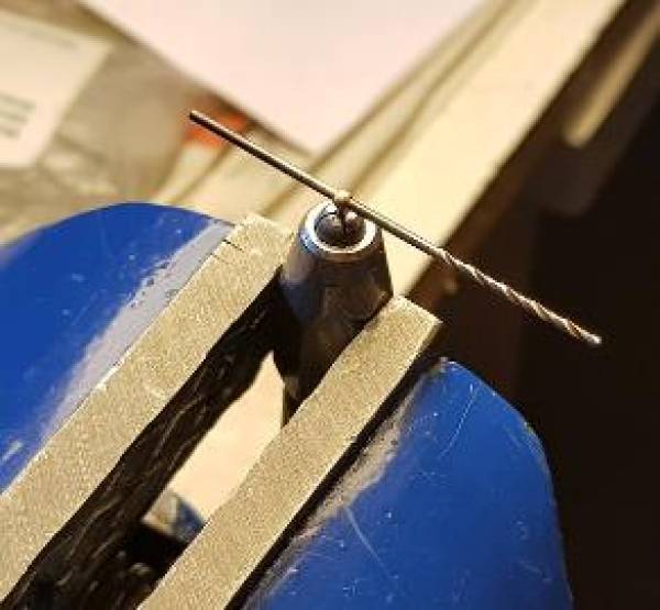 Nick Dunhill - Nov 14, 2017 at 5:40 PM …..cab door handrails. I bought some Laurie Griffin tapered handrails and they have cleaned up nicely. Spinning them in a mini drill and polishing them with wet-or-dry (hold both sides) straightens them up. I measured the position of the base holes for the handrails off the GA and pre-drilled them before soldering on the tank/cab/bunker sides. To my horror the cab cut-out beading was slightly too short (also to be completely accurate it's offset so that is thicker on the inside than the outside.) Here's how I got round it. Ends too short, so splice a bit in. There's some scrap material on the etch that's the correct thickness. Solder with high temp solder (electrical at 240deg.)