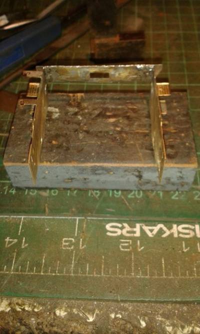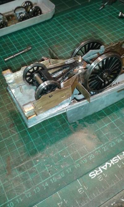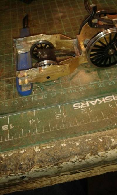 After a bit of a wait for Reading to collect the new motor to fit the story continues ! The running session at Bourne End confirmed that the mods seen in the photos work and it will now go round 6ft radius curves.all that the rear of the chassis needs Is strengthening plates putting in to stop the weak overlays flexing and a tidy up.However another problem has reared it head.this morning I put the new Finescale Brass motor unit in fitted the pickups to the center wheels and put the rods on,the extra pickups I hoped would cure the erratic running I was getting but on my test track it was still quite bad.The problem turned out to be with the front bogie with the body on the spring was fully compressed and was stopping the front and middle driving wheels from fully touching the track.Allso the pin for the bogie was too short stopping the bogie from dropping down to pass over undulations in the track. The problem was solved by unsoldered the mounting plate and moving it higher up the chassis to be 7mm from the bottom edge,the too short pin was replaced with a 6ba bolt and when the spring was put on and the bogie held with a nylock nut the loco ran perfectly.It now has just over 1mm upward movement and over 2mm down.The downward drop can be controlled with the nylock nut. This chassis is turning into a bit of a pig to get right but it's nearly there,watch this space for more ups and downs.I will post a photo of the fully modified rear end when it's all Done! Pat.