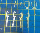 What follows, are some modifications I have made to the standard Dingham autocouplings to enhance their flexibility and increase their robustness. Having experienced cases where the standard Dingham couplings are bent from heavy shunting, movement in transit boxes etc., I now double the thicknesses of all hooks, latches and loops by using two of each fret (as prepared in Photo 1).