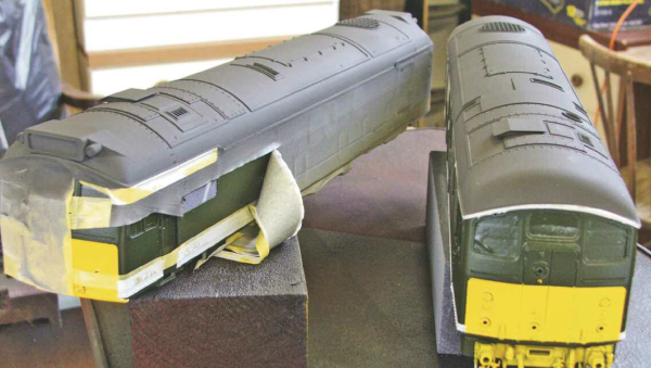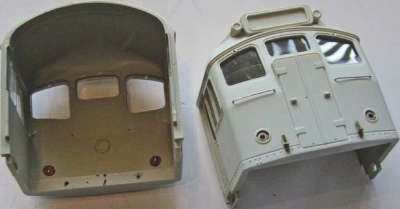 Before I fitted the cabs to the body, I masked up the windows ready for spraying, on the basis that if I over enthusiastically pressed on the tape it would be easy enough to glue the window back in whilst there was still good access. They are pretty difficult to get at once the cab is on the body. I have noticed that other builders have craftily modified the cab bulkhead to make it removable, as designed it has lugs that fit into rebates in the sides and once fitted in will never come out. The class 24 has the buffer beam moulded as part of the cab and it’s probably easier to fit all the pipes and other bits at that time.