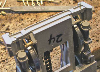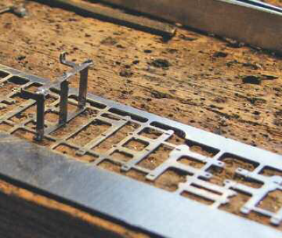 The etched holes didn’t match the mounting points on the bodyside, so I drilled new mounting holes for the lower fixing point and filled the redundant ones with solder. Adding the mounting wire and this alteration is all best done with them still in the fret. They also seemed a little wide as etched, so I filed some material off each side to reduce their width. They certainly look better for that.