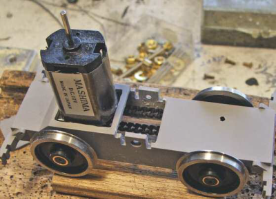 The main bogie frame, with an opening cut to allow the motor to mount on the Markits gearbox. I