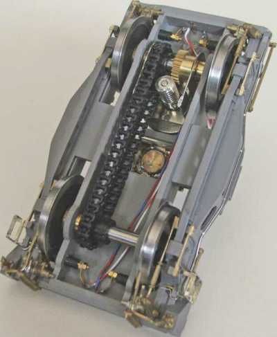 The design of the bogies requires screwing the motor directly to the frame. Rumours abound in any hobby and I discounted any stories of resin bogies melting when the motors got hot, not hearing of any first hand. However I wanted more control over the motor/axle relationship and opted to use the Markits MM1 gearbox. A rectangular hole needs to be cut in the bogie top to allow the motor to pass through. This was achieved by drilling four holes, one in each corner, and using a piercing saw to join them up. I had to reduce the width of the Delrin drive cog to allow it to co-exist with the drive gear, and mounted the gearbox bearings on the outsides of the gearbox to maximise the space inside. I’m not saying the design of the kit is wrong or right, this is just how I chose to do it. It doesn’t say in the instructions, but it’s probably best to glue the axle bearings in place. If one were to stick on the axle, it might cause problems with the resin frame. I also found that the Delrin cog teeth on the outer wheelset were very close to the inside surface of the frame, so I used a large drill twisted by hand to create a recess above it to give some clearance.