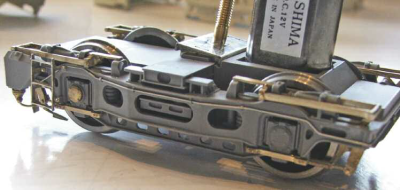 A side view of the completed bogie, all the brass parts were glued on with ZAP CA. Diesel bogies have a lot of detail and it’s great to