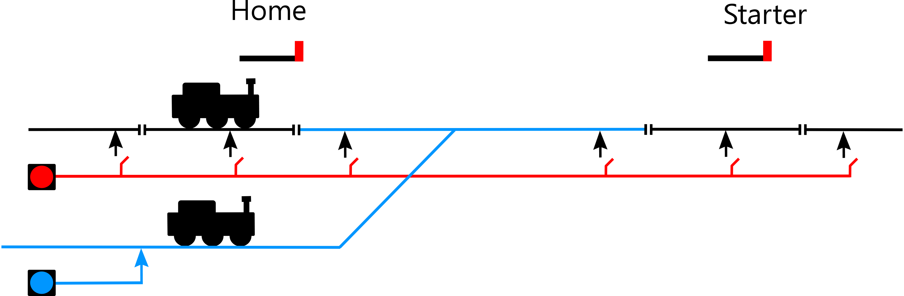 The wish to shunt stock to/from the train engine fits with this thinking. It also permits one controller to drive two trains around the circuit, one at a time, paying proper regard to the signals. For example, an approaching train can be held at the Home signal until the train in the station has departed beyond its Starter signal.